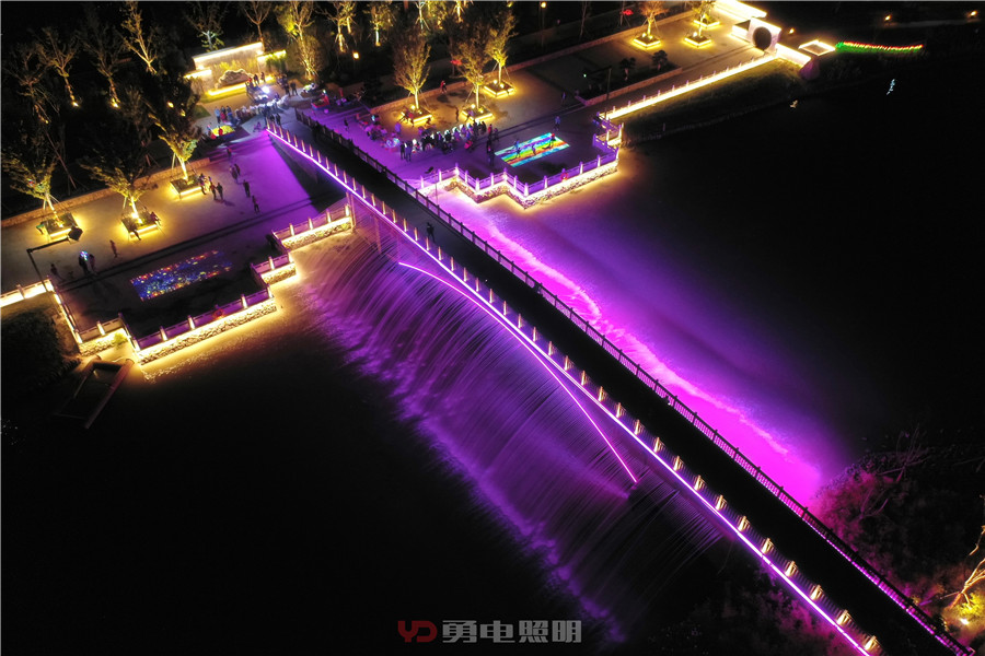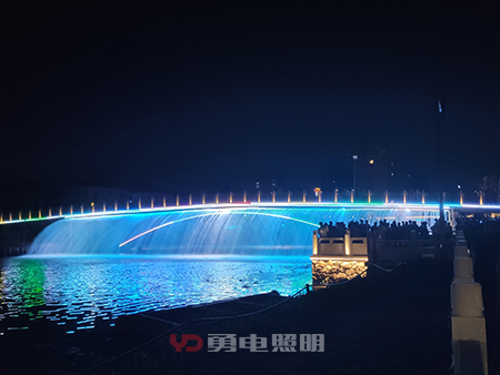 大橋兩側(cè)噴泉瀑布隨著五顏六色光的變化